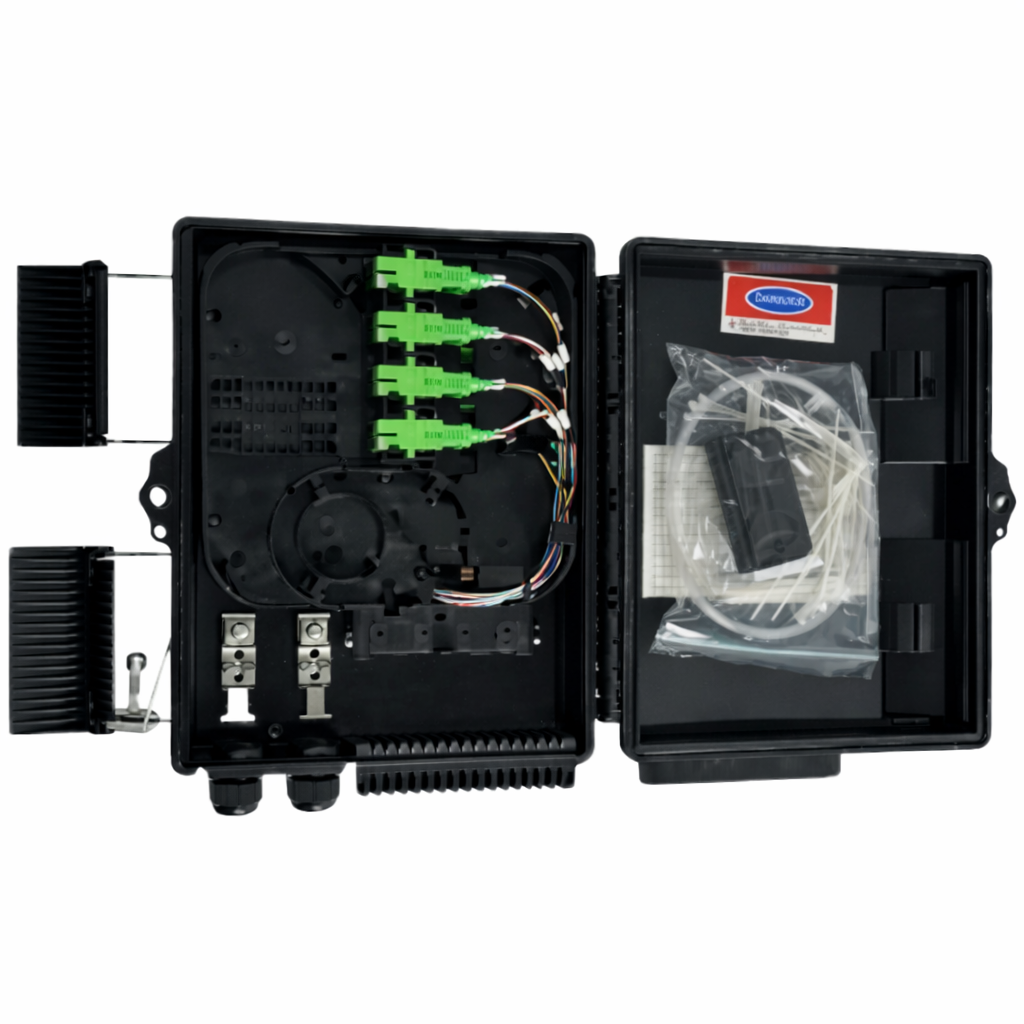 Caja de terminación de FTTH 4FO IP65 cargada con Splitter 1*4 SC/APC + 4 Adaptadores SC/APC, Negra