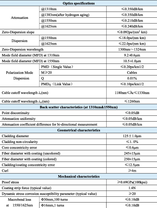 - Rendimiento de Fibra G.652D: La fibra monomodo G.652D garantiza un rendimiento de baja atenuación, con valores de <=0.350 dB/km a 1310nm y <=0.210 dB/km a 1550nm.